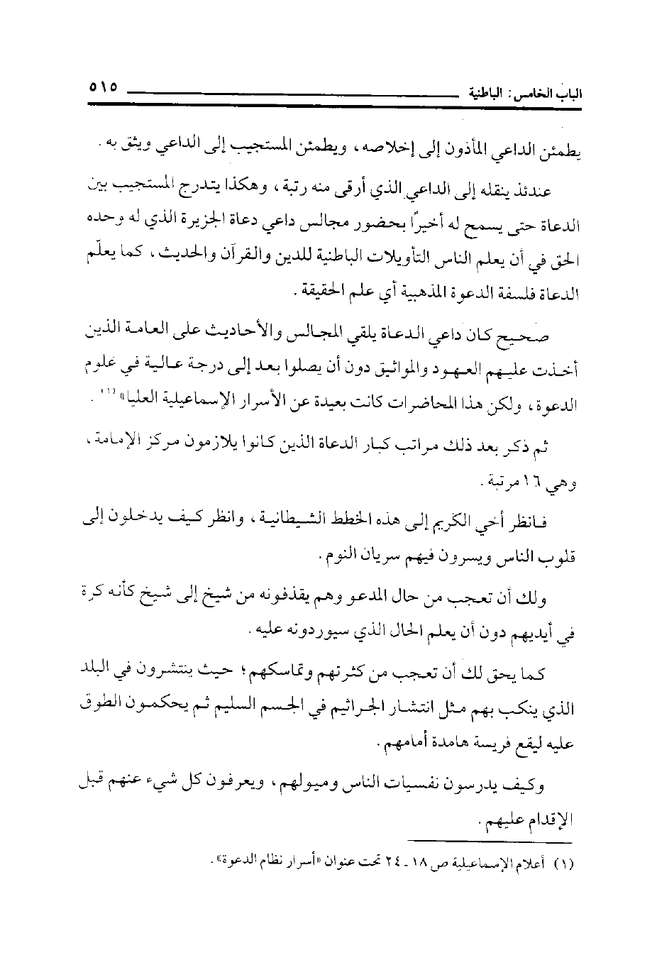 (¬1) أعلام الإسماعيلية ص 18- 24 تحت عنوان ((أسرار نظام الدعوة)) .