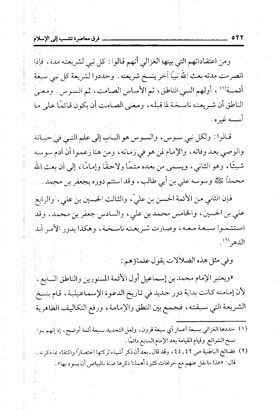 (¬2) فضائح الباطنية ص 42- 44، وقد قال - بعد أن ذكر أشياء كثيرة تركتها اختصاراً واكتفاء بما ذكرته - قال: ((هذا ما نقل عنهم مع خرافات كثيرة أهملنا ذكرها ضنة بالبياض أن يسود بها)) .