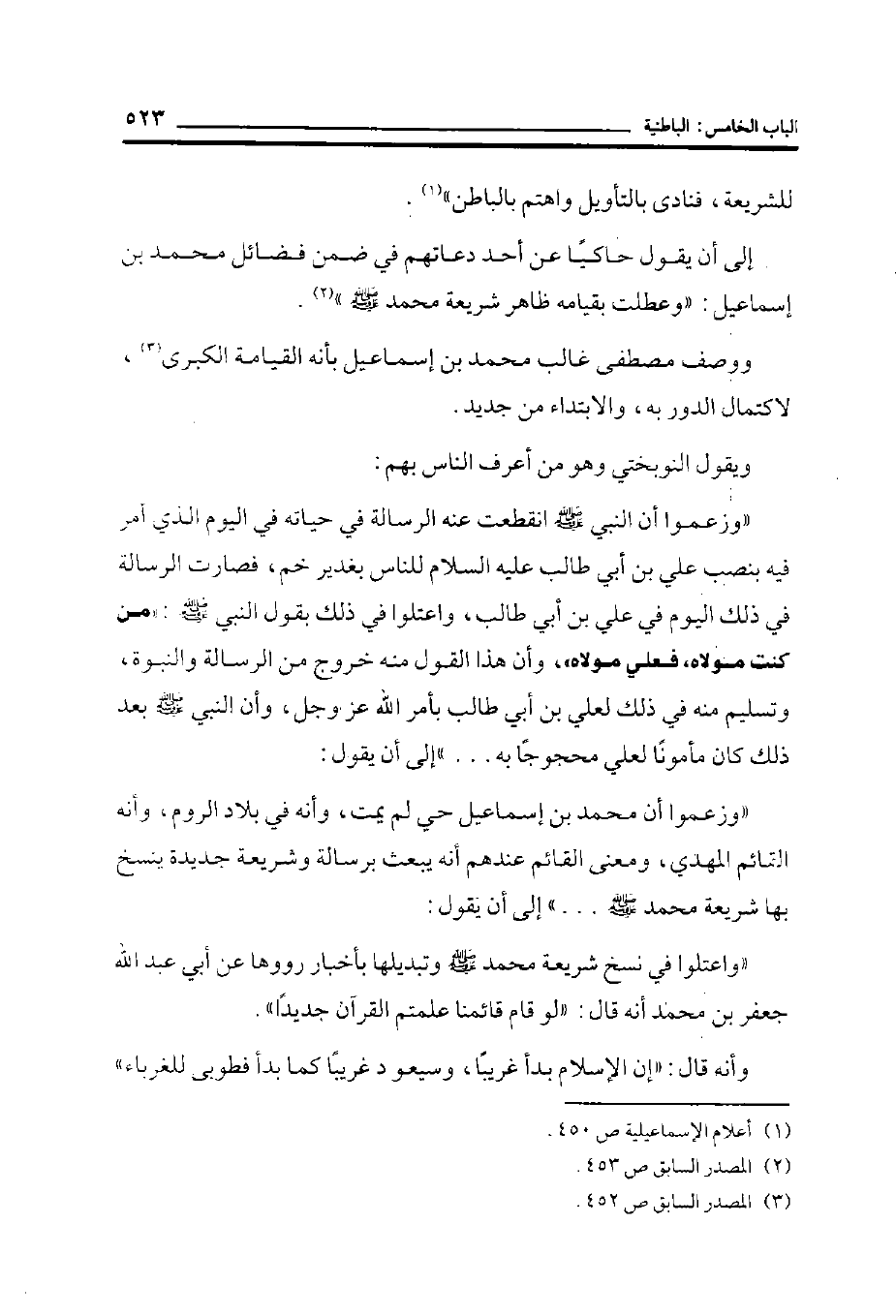 ((وزعموا أن محمد بن إسماعيل حيّ لم يمت، وأنه في بلاد الروم، وأنه القائم المهدي، معنى القائم عندهم أنه يبعث برسالة وشريعة جديدة ينسخ بها شريعة محمد صلى الله عليه وسلم ... )) إلى أن يقول: