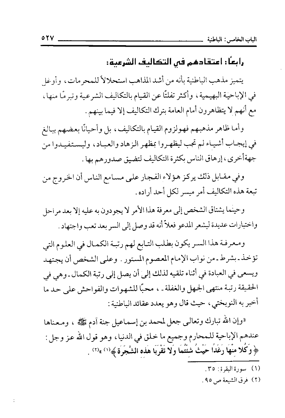 ((وإن الله تعارك وتعالى جعل لمحمد بن إسماعيل جنة آدم صلى الله عليه وسلم، ومعناها عندهم الإباحية للمحارم وجميع ما خلق في الدنيا، وهو قول الله عز وجل: {وَكُلا مِنْهَا رَغَداً حَيْثُ شِئْتُمَا وَلا تَقْرَبَا هَذِهِ الشَّجَرَةَ} (¬1)) (¬2) .
