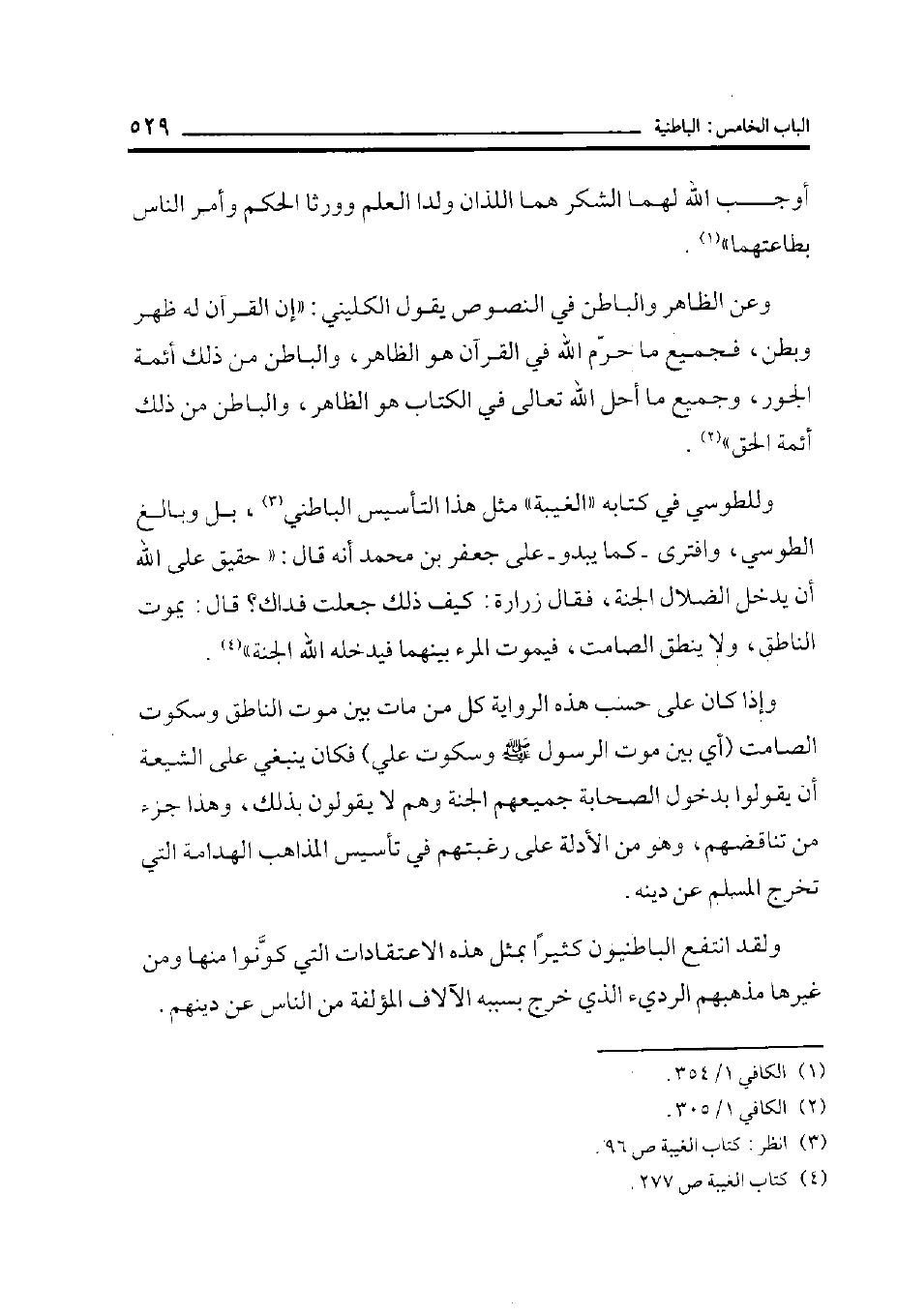 وللطوسي في كتابه ((الغيبة)) مثل هذا التأسيس الباطني (¬3) ، بل وبالغ الطوسي، وافترى -كما يبدو- على جعفر بن محمد أنه قال: ((حقيق على الله أن يدخل الضلال الجنة، فقال زرارة: كيف ذلك جُعلت فداك؟ قال: يموت الناطق، ولا ينطق الصامت، فيموت المرء بينهما فيدخله الله الجنة)) (¬4) .