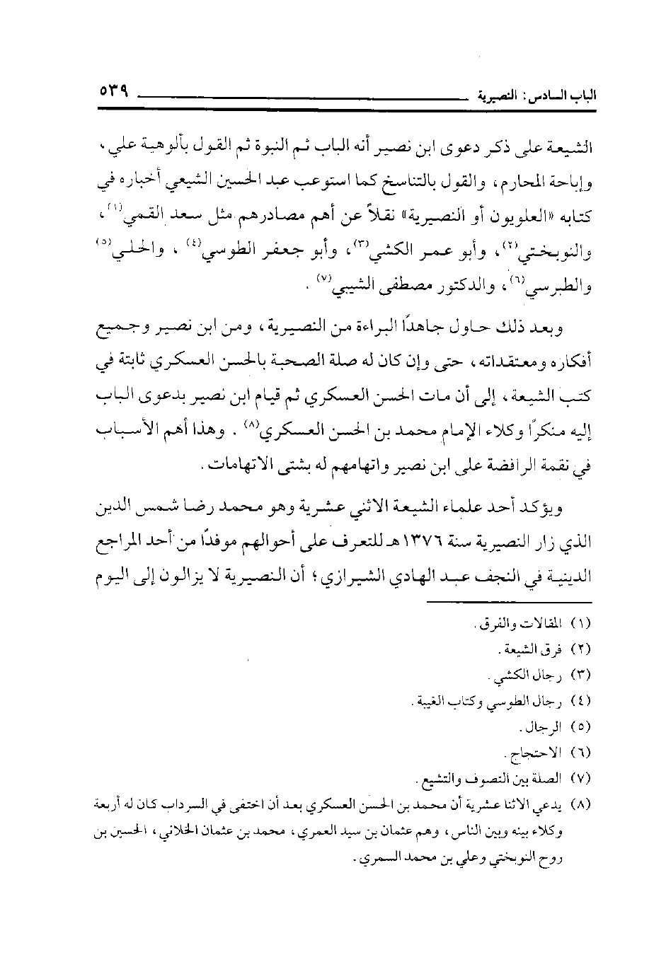 الشيعة على ذكر دعوى ابن نصير أنه الباب ثم النبوة ثم القول بألوهية علي، وإباحية المحارم، والقول بالتناسخ كما استوعب عبد الحسين الشيعي أخباره في كتابه ((العلويون أو النصيرية)) نقلاً عن أهم مصادرهم مثل سعد القمي (¬1) ، والنوبختي (¬2) ، وأبو عمر الكشي (¬3) ، وأبو جعفر الطوسي (¬4) ، والحلي (¬5) والطبرسي (¬6) ، والدكتور مصطفى الشيبي (¬7) .