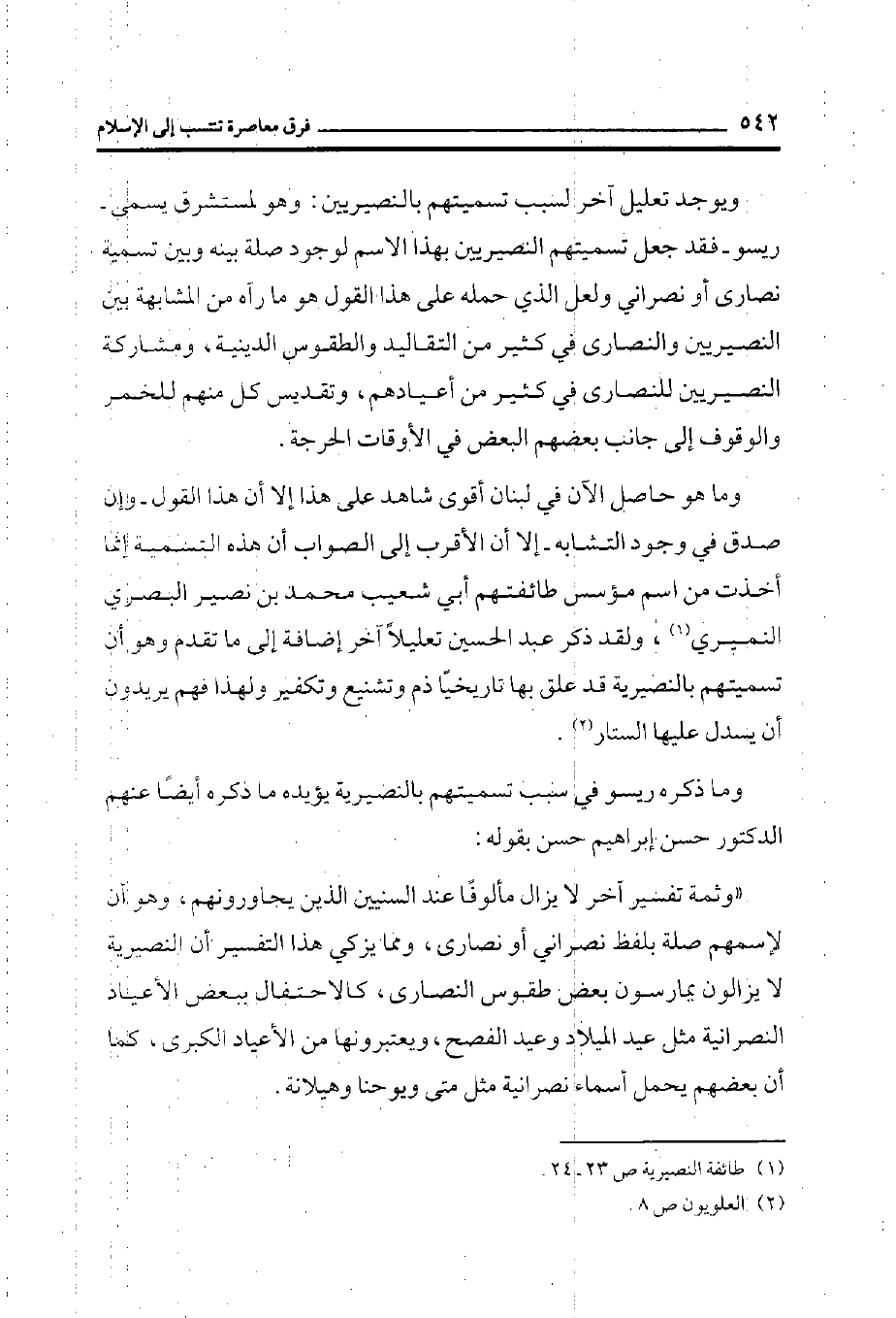 وما هو حاصل الآن في لبنان أقوى شاهد على هذا إلا أن هذا القول -وإن صدق في وجود التشابه- إلا أن الأقرب إلى الصواب أن هذه التسمية إنما أخذت من اسم مؤسس طائفتهم أبي شعيب محمد بن نصير البصري النميري (¬1) ، ولقد ذكر عبد الحسين تعليلاً آخر إضافة إلى ما تقدم وهو أن تسميتهم بالنصيرية قد علق بها تاريخياً ذم وتشنيع وتكفير ولهذا فهم يريدون أن يسدل عليها الستار (¬2) .