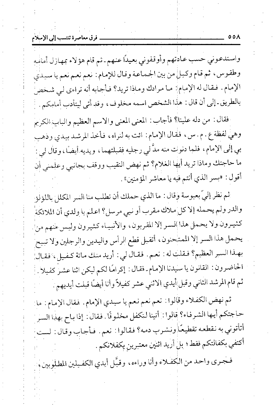 فقال: من دله علينا؟ فأجاب: المعنى المعنى والاسم العظيم والباب الكريم وهي لفظة ع. م. س، فقال الإمام: ائت به لنراه، فأخذ المرشد بيدي وذهب بي إلى الإمام، فلما دنوت منه مدَّ لي رجليه فقبلتهما، ويديه أيضاً، وقال لي: ما حاجتك وماذا تريد أيها الغلام؟ ثم نهض النقيب ووقف بجانبي وعلمني أن أقول: ((بسر الذي فيه أنتم يا معاشر المؤمنين)) .