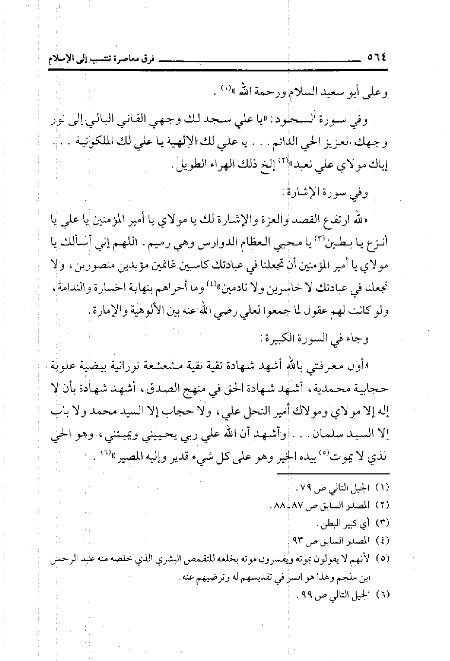 وفي سورة السجود: ((يا علي سجد لك وجهي الفاني البالي إلى نور وجهك العزيز الحي الدائم ... يا علي لك الإلهية يا علي لك الملكوتية ... إياك مولاي علي نعبد)) (¬2) إلخ ذلك الهراء الطويل.