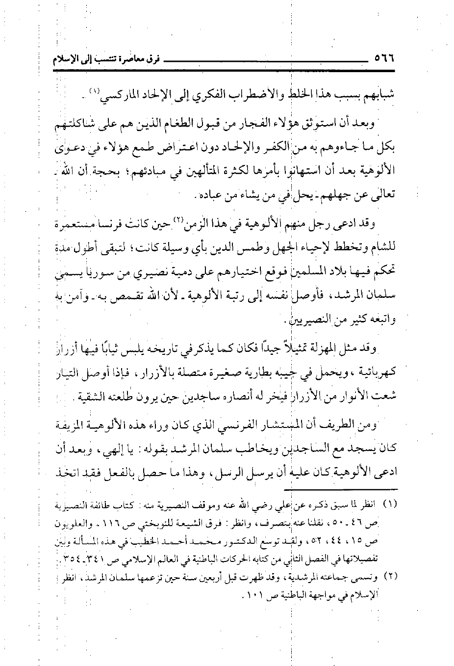 وقد ادعى رجل منهم الألوهية في هذا الزمن (¬2) حين كانت فرنسا مستعمرة للشام وتخطط لإحياء الجهل وطمس الدين بأي وسيلة كانت؛ لتبقى أطول مدة تحكم فيها بلاد المسلمين فوقع اختيارهم على دمية نصيري من سوريا يسمى سلمان المرشد، فأوصل نفسه إلى رتبة الألوهية- لأن الله تقمص به- وآمن به واتبعه كثير من النصيريين.
