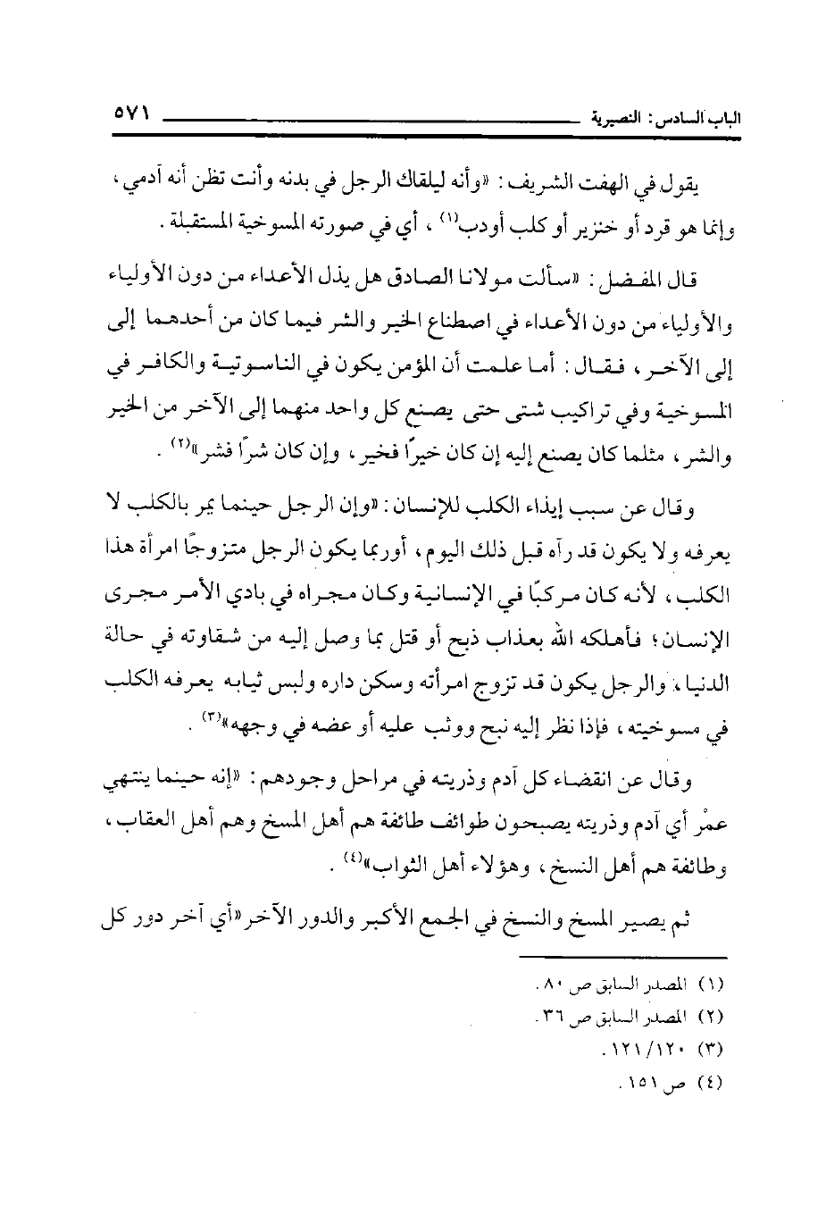 قال المفضل: ((سألت مولانا الصادق هل يذل الأعداء من دون الأولياء والأولياء من دون الأعداء في اصطناع الخير والشر فيما كان من أحدهما إلى الآخر، فقال: أما علمت أن المؤمن يكون في الناسوتية والكافر في المسوخية وفي تراكيب شتى حتى يصنع كل واحد منهما إلى الآخر من الخير والشر، مثلما كان يصنع إليه إن كان خيراً فخير، وإن كان شراً فشر)) (¬2) .