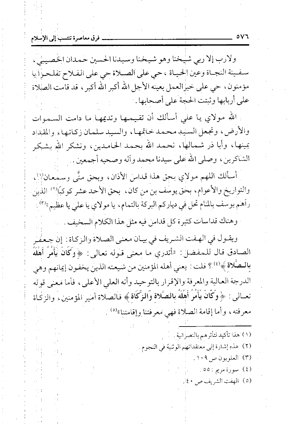 ويقول في الهفت الشريف في بيان معنى الصلاة والزكاة: إن جعفر الصادق قال للمفضل: ((أتدري ما معنى قوله تعالى: {وَكَانَ يَأْمُرُ أَهْلَهُ بِالصَّلَاةِ} (¬4) ؟ قلت: يعني أهله المؤمنين من شيعته الذين يخفون إيمانهم وهي الدرجة العالية والمعرفة والإقرار بالتوحيد وأنه العلي الأعلى، فأما معنى قوله تعالى: {وَكَانَ يَأْمُرُ أَهْلَهُ بِالصَّلَاةِ وَالزَّكَاةِ} فالصلاة أمير المؤمنين، والزكاة معرفته، وأما إقامة الصلاة فهي معرفتنا وإقامتنا)) (¬5) .