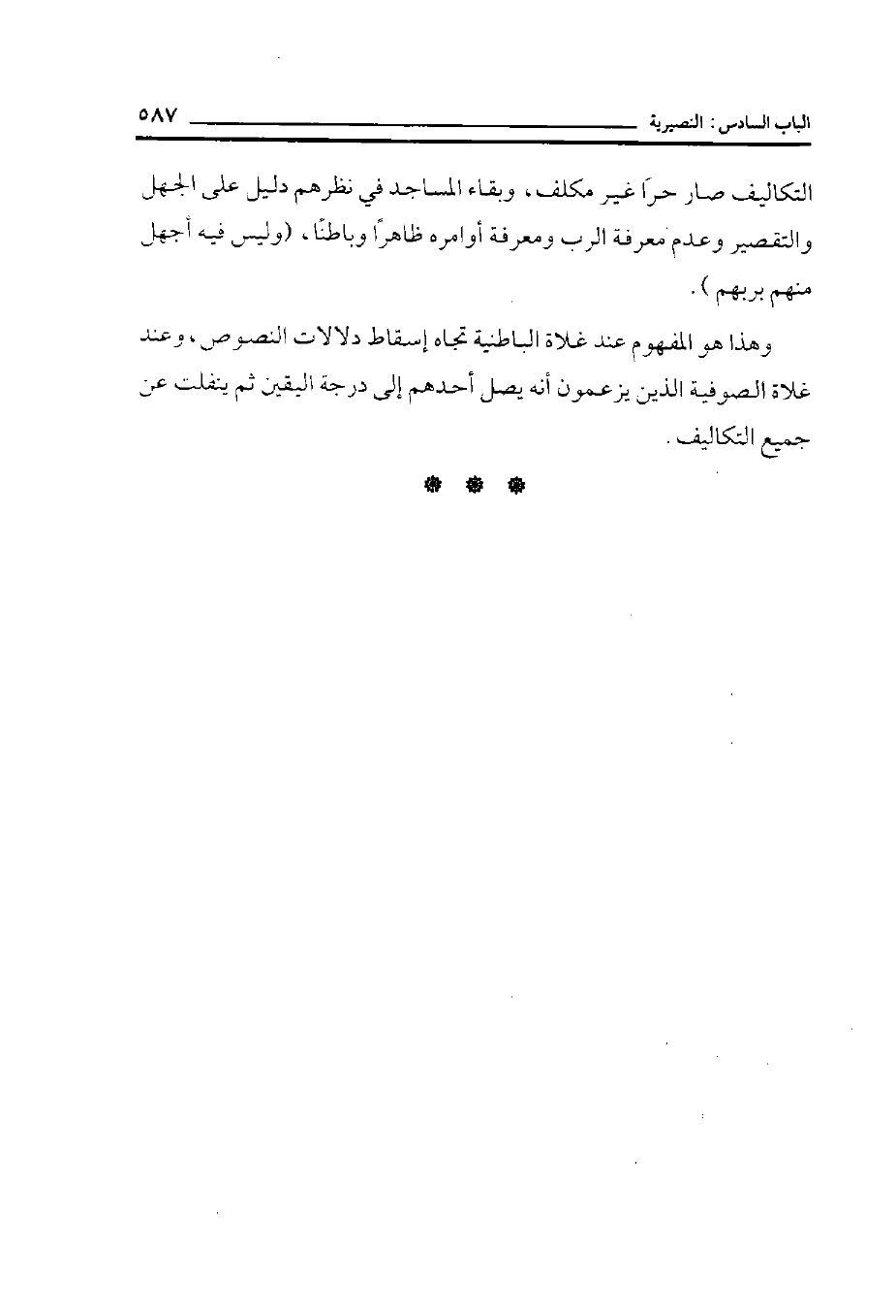 وهذا هو المفهوم عند غلاة الباطنية تجاه إسقاط دلالات النصوص، وعند غلاة الصوفية الذين يزعمون أنه يصل أحدهم إلى درجة اليقين ثم ينفلت عن جميع التكاليف.