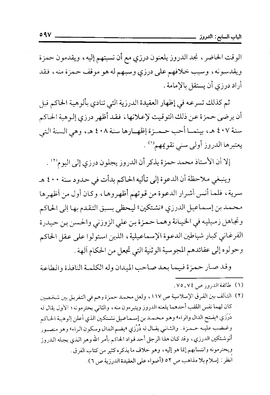 (¬2) التآلف بين الفرق الإسلامية ص 117، ولعل محمد حمزة وهم في التفريق بين شخصين كان لهما نفس اللقب أحدهما يلعنه الدروز ويتبرءون منه، والثاني يحترمونه؛ الأول يقال له دَرَزي ((بفتح الدال والراء)) وهو محمد بن إسماعيل نشتكين الذي أعلن إلوهية الحاكم وغضب عليه حمزة. والثاني يقال له دُرْزي ((بضم الدال وسكون الراء)) وهو منصور أنوشتكين الدرزي، وقد كان هذا الرجل أحد قواد الحاكم بأمر الله، وهو الذي يجله الدروز ويحترمونه وانتسابهم إنما هو إليه، وهو خلاف ما يذكره كثير من كتاب الفرق.