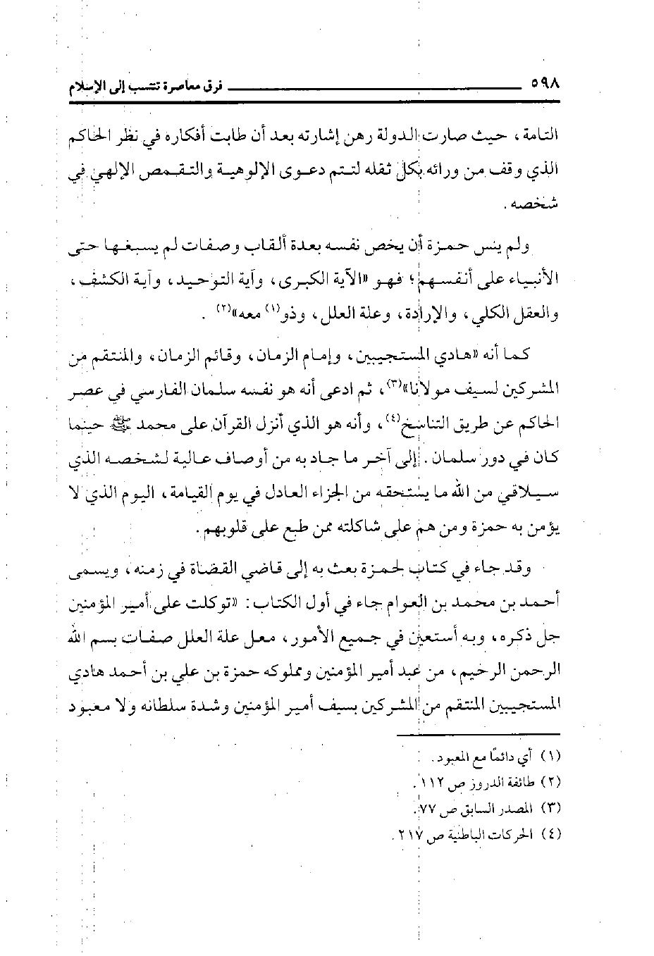 كما أنه ((هادي المستجيبين، وإمام الزمان، وقائم الزمان، والمنتقم من المشركين لسيف مولانا)) (¬3) ، ثم ادعى أنه هو نفسه سلمان الفارسي في عصر الحاكم عن طريق التناسخ (¬4) ، وأنه هو الذي أنزل القرآن على محمد صلى الله عليه وسلم حينما كان في دور سلمان. إلى آخر ما جاد به من أوصاف عالية لشخصه الذي سيلاقي من الله ما يستحقه من الجزاء العادل في يوم القيامة، اليوم الذي لا يؤمن به حمزة ومن هم على شاكلته ممن طبع على قلوبهم.