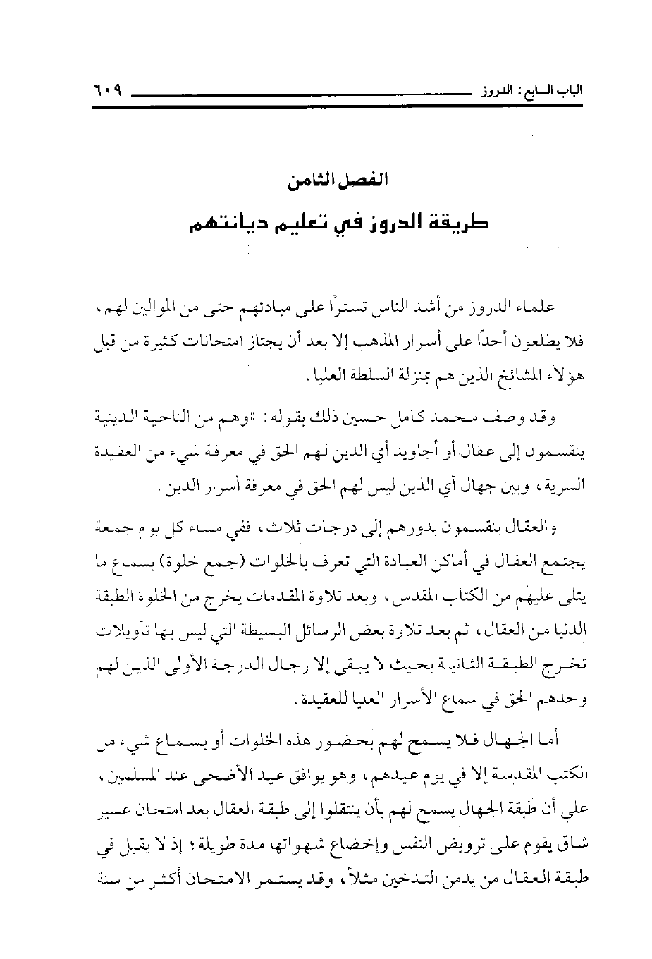 أما الجهال فلا يسمح لهم بحضور هذه الخلوات أو بسماع شيء من الكتب المقدسة إلا في يوم عيدهم، وهو يوافق عيد الأضحى عند المسلمين، على أن طبقة الجهال يسمح لهم بأن ينتقلوا إلى طبقة العقال بعد امتحان عسير شاق يقوم على ترويض النفس وإخضاع شهواتها مدة طويلة؛ إذ لا يقبل في طبقة العقال من يدمن التدخين مثلاً، وقد يستمر الامتحان أكثر من سنة