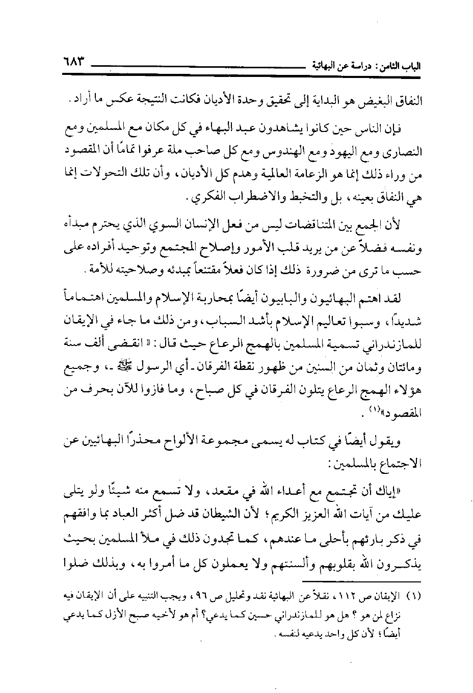 (¬1) الإيقان ص 112، نقلاً عن البهائية نقد وتحليل ص 96، ويجب التنبيه على أن الإيقان فيه نزاغ لمن هو؟ هل هو للمازندراني حسين كما يدعي؟ أم هو لأخيه صبح الأزل كما يدعي أيضاً؛ لأن كل واحد يدعيه لنفسه.