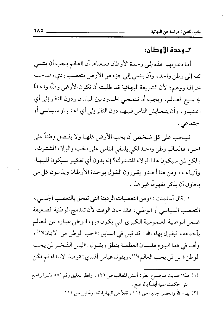 أما دعوتهم هذه إلى وحدة الاوطان فمعناها أن العالم يجب أن ينتمي كله إلى وطن واحد، وأن ينتمي إلى جزء من الأرض متعصب رديء صاحب خرافة ووهم، لأن الشريعة البهائية قد طلبت أن تكون الأرض وطناً واحداً لجميع العالم، ويجب أن تنمحي الحدود بين البلدان ودون النظر إلى أي اعتبار، وأن يتعايش الناس فيها دون النظر إلى أي اعتبار سياسي أو اجتماعي.