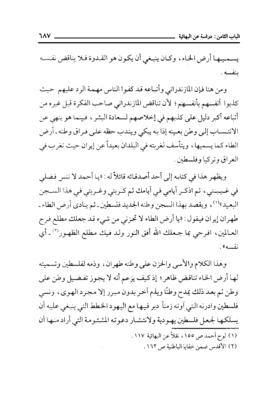وهذا الكلام والأسى والحزن على وطنه طهران وذمه لفلسطين وتسميته لها أرض الخاء تناقض ظاهر؛ إذ كيف يزعم أنه لا يجوز تفضيل وطن على وطن ثم بعد ذلك يمدح وطناً ويذم آخر بدون مبرر إلا مجرد الهوى، ونسي فلسطين وأدرنة التي آوته زمناً دبر فيها مع اليهود الخطط التي ينبغي عليه أن يسلكها لجعل فلسطين يهودية ولانتشار دعوته المشئومة التي أراد منها أن