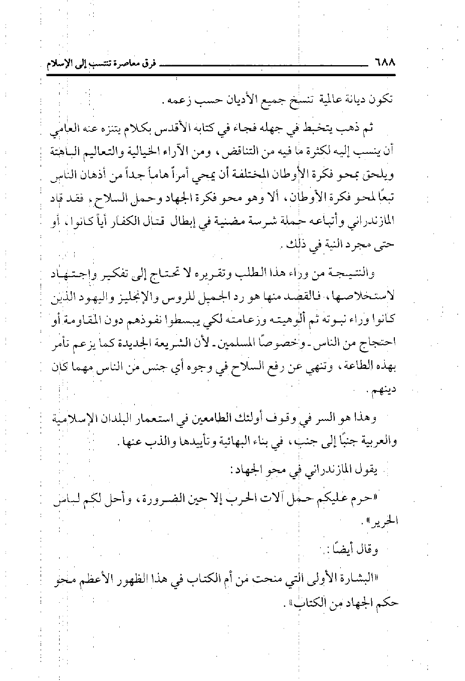 ثم ذهب يتخبط في جهله فجاء في كتاب الأقدس بكلام يتنزه عنه العامي أن ينسب إليه لكثرة ما فيه من التناقض، ومن الآراء الخيالية والتعاليم الباهتة ويلحق بمحو فكرة الأوطان المختلفة أن يمحي أمراً هاماً جداً من أذهان الناس تبعاً لمحو فكرة الأوطان، ألا وهو محو فكرة الجهاد وحمل السلاح، فقد قاد المازندراني وأتباعه حملة شرسة مضنية في إبطال قتال الكفار أياً كانوا، أو حتى مجرد النية في ذلك.