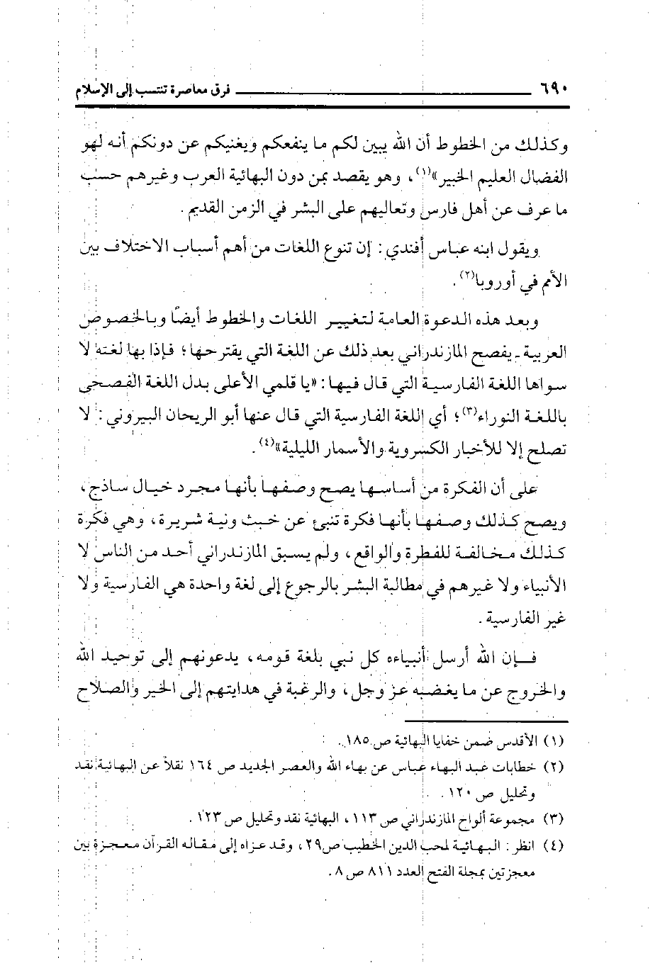 (¬4) انظر: البهائية لمحب الدين الخطيب ص29، وقد عزاه إلى مقاله القرآن معجزة بين معجزتين بمجلة الفتح العدد 811 ص 8.