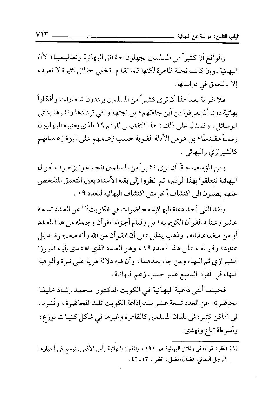 ولقد ألقى أحد دعاة البهائية محاضرات في الكويت (¬1) عن العدد تسعة عشر وعناية القرآن الكريم به؛ بل وقيام أجزاء القرآن وجمله من هذا العدد أو من مضاعفاته، وذهب يدلل على أن القرآن من الله وأنه معجزة بدليل عنايته وقيامه على هذا العدد 19، وهو العدد الذي اهتدى إليه الميرزا الشيرازي ثم البهاء ومن جاء بعدهما، وأن فيه دلالة قوية على نبوة وألوهية البهاء في القرن التاسع عشر حسب زعم البهائية.