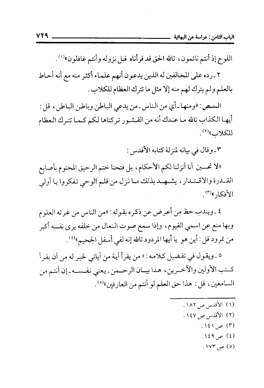 ويقول في تفضيل كلامه: ((من يقرأ من آياتي لخير له من أن يقرأ كتب الأولين والآخرين، هذا بيان الرحمن- يعني نفسه- إن أنتم من السامعين، قل: هذا حق العلم لو أنتم من العارفين)) (¬5) .