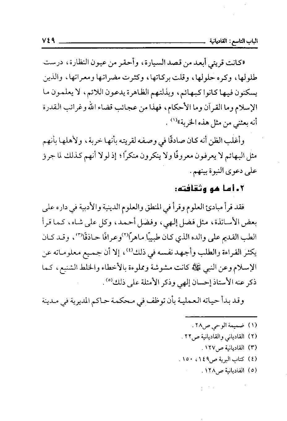 فقد قرأ مبادئ العلوم وقرأ في المنطق والعلوم الدينية والأدبية في داره على بعض الأساتذة، مثل فضل إلهي، وفضل أحمد، وكل على شاه، كما قرأ الطب القديم على والده الذي كان طبيباً ماهراً (¬2) وعرافاً حاذقاً (¬3) ، وقد كان يكثر القراءة والطلب وأجهد نفسه في ذلك (¬4) ، إلا أن جميع معلوماته عن الإسلام وعن النبي صلى الله عليه وسلم كانت مشوشة ومملوءة بالأخطاء والخلط الشنيع، كما ذكر عنه الأستاذ إحسان إلهي وذكر الأمثلة على ذلك (¬5) .