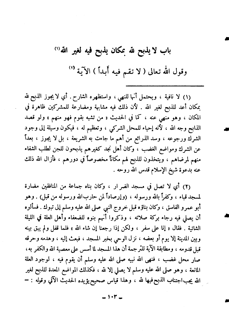 (1) لا نافية، ويحتمل أنها للنهي، واستظهره الشارح. أي لا يجوز الذبح لله بمكان أعد للذبح لغير الله؛ لأن ذلك فيه مشابهة ومضارعة للمشركين ظاهرة في المكان، وهو منهي عنه، كما في الحديث: " من تشبه بقوم فهو منهم "2. ولو قصد الذابح وجه الله؛ لأنه إحياء للمحل الشركي، وتعظيم له، فيكون وسيلة إلى وجود الشرك ورجوعه، وسد الذرائع من أهم ما جاءت به الشريعة، بل لا يجوز بعدا عن الشرك ومواضع الغضب، وكان أهل نجد كغيرهم يذبحون للجن لطلب الشفاء منهم لمرضاهم، ويتخذون للذبح لهم مكانا مخصوصا في دورهم، فأزال الله ذلك عنه بدعوة شيخ الإسلام قدس الله روحه.