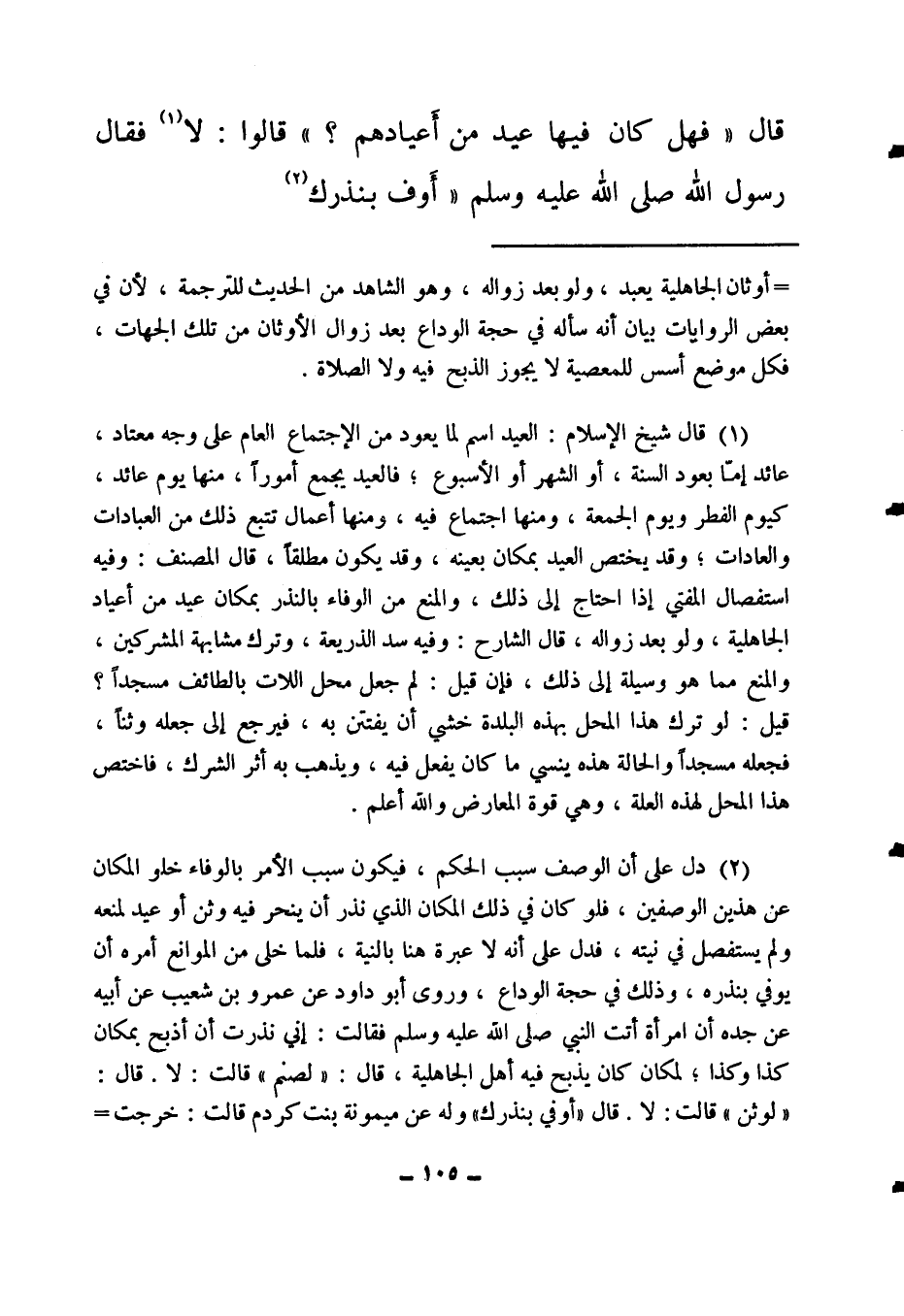 (1) قال شيخ الإسلام: العيد اسم لما يعود من الاجتماع العام على وجه معتاد عائد إما بعود السنة أو الشهر أو الأسبوع، فالعيد يجمع أمورا: منها يوم عائد كيوم الفطر ويوم الجمعة، ومنها اجتماع فيه، ومنها أعمال تتبع ذلك من العبادات والعادات، وقد يختص العيد بمكان بعينه، وقد يكون مطلقا، قال المصنف: ((وفيه استفصال المفتي إذا احتاج إلى ذلك، والمنع من الوفاء بالنذر بمكان عيد من أعياد الجاهلية ولو بعد زواله)) . قال الشارح: وفيه سد الذريعة، وترك مشابهة المشركين، والمنع مما هو وسيلة إلى ذلك، فإن قيل: لم جعل محل اللات بالطائف مسجدا؟ قيل: لو ترك هذا المحل بهذه البلدة خشي أن يفتتن به، فيرجع إلى جعله وثنا، فجعله مسجدا والحالة هذه ينسي ما كان يفعل فيه، ويذهب به أثر الشرك، فاختص هذا المحل لهذه العلة، وهي قوة المعارض والله أعلم.