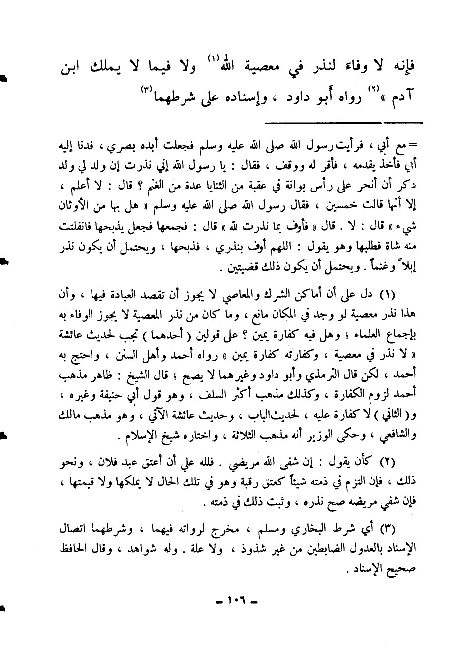 فإنه لا وفاء لنذر في معصية الله (1) ، ولا فيما لا يملك آدم " 1 (2) ، رواه أبو داود، وإسناده على شرطهما (3) .