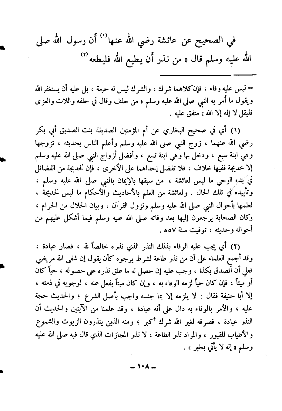(2) أي يجب عليه الوفاء بذلك النذر الذي نذره خالصا لله، فصار عبادة، وقد أجمع العلماء على أن من نذر طاعة لشرط يرجوه كأن يقول: إن شفى الله مريضي فعلي أن أتصدق بكذا، وجب عليه إن حصل له ما علق نذره على حصوله، حيا كان أو ميتا، فإن كان حيا لزمه الوفاء به، وإن كان ميتا يفعل عنه، لوجوبه في ذمته، إلا أبا حنيفة فقال: لا يلزمه إلا بما جنسه واجب بأصل الشرع، والحديث حجة عليه، والأمر بالوفاء به دال على أنه عبادة، وقد علمنا من الآيتين والحديث أن النذر عبادة، فصرفه لغير الله شرك أكبر، ومنه الذين ينذرون الزيوت والشموع والأطياب للقبور، والمراد نذر الطاعة، لا نذر المجازات الذي قال فيه صلى الله عليه وسلم: " إنه لا يأتي بخير " 2.