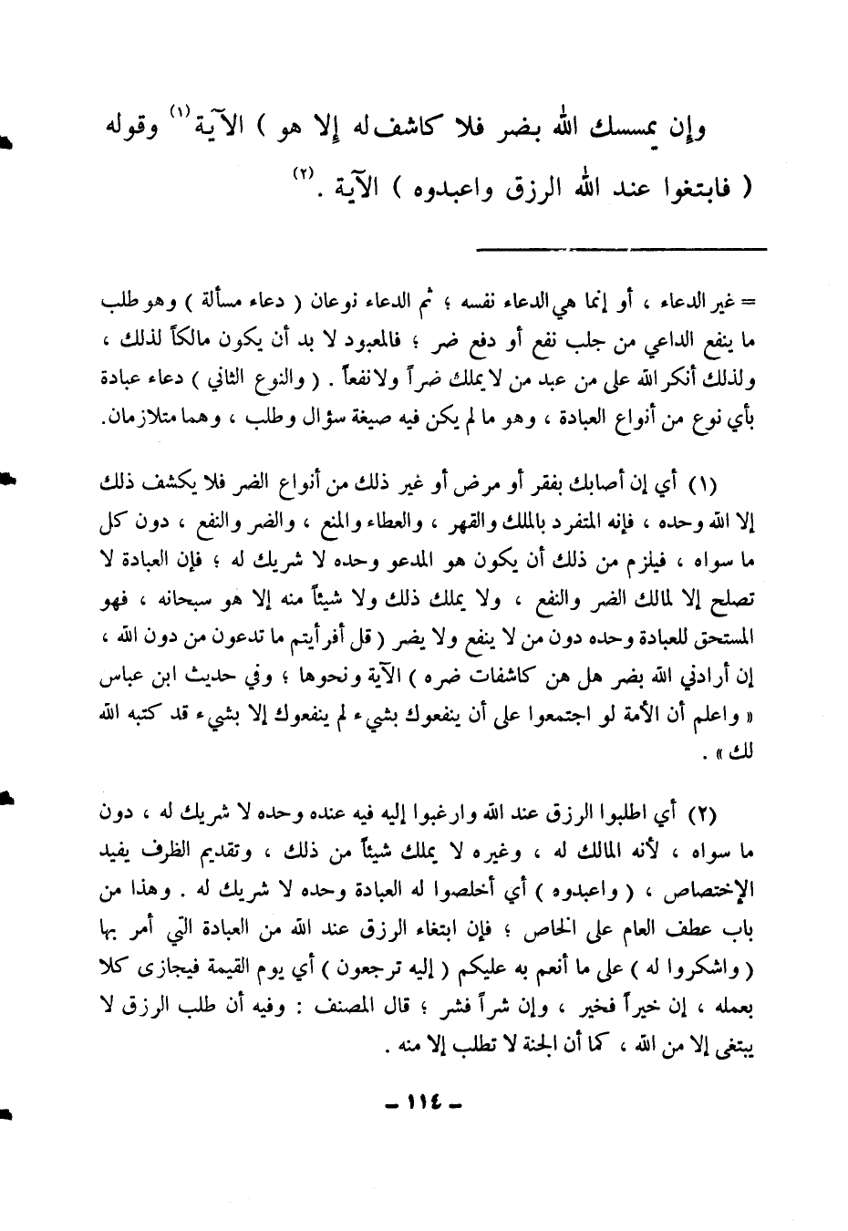 {وَإِنْ يَمْسَسْكَ اللَّهُ بِضُرٍّ فَلا كَاشِفَ لَهُ إِلاَّ هُوَ} (1) الآية 1، وقوله:: {فَابْتَغُوا عِنْدَ اللَّهِ الرِّزْقَ وَاعْبُدُوهُ} (2) الآية 2.