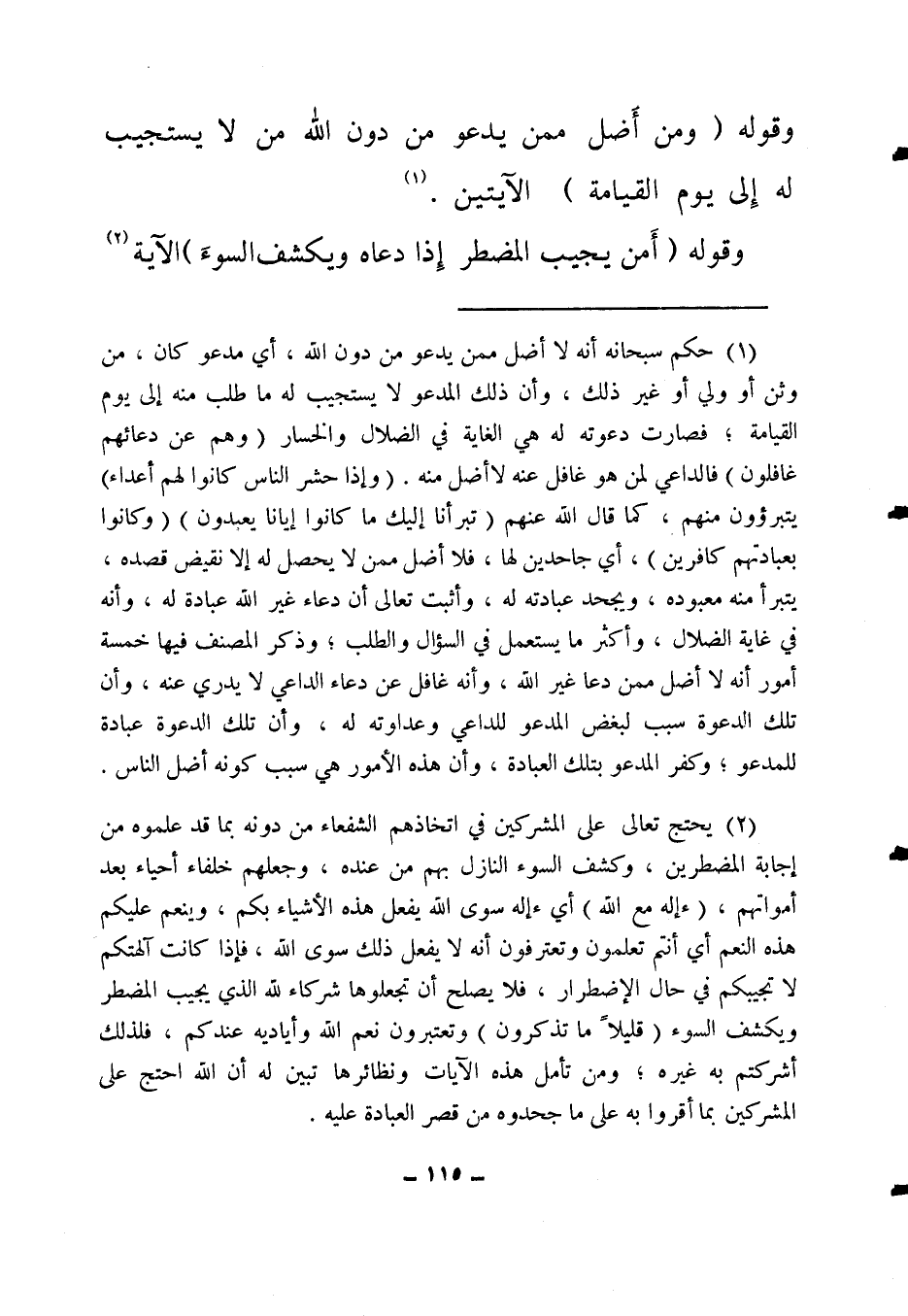 (1) حكم سبحانه أنه لا أضل ممن يدعو من دون الله أيّ مدعو كان، من وثن أو ولي أو غير ذلك، وأن ذلك المدعو لا يستجيب له ما طلب منه إلى يوم القيامة، فصارت دعوته له هي الغاية في الضلال والخسار: {وَهُمْ عَنْ دُعَائِهِمْ غَافِلُونَ} 3، فالداعي لمن هو غافل عنه لا أضل منه {وَإِذَا حُشِرَ النَّاسُ كَانُوا لَهُمْ أَعْدَاءً} . (4 يتبرؤون منهم، كما قال الله عنهم: {تَبَرَّأْنَا إِلَيْكَ مَا كَانُوا إِيَّانَا يَعْبُدُونَ} 5. {وَكَانُوا بِعِبَادَتِهِمْ كَافِرِينَ} 6 أي جاحدين لها، فلا أضل ممن لا يحصل له إلا نقيض قصده، يتبرأ منه معبوده، ويجحد عبادته له، وأثبت تعاليمه أن دعاء غير الله عبادة له وأنه في غاية الضلال، وأكثر ما يستعمل في السؤال والطلب. وذكر المصنف فيها خمسة أمور أنه لا أضل ممن دعا غير الله، وأنه غافل عن دعاء الداعي لا يدري عنه، وأن تلك الدعوة سبب لبغض المدعو للداعي وعداوته له، وأن تلك الدعوة عبادة للمدعو، وكفر المدعو بتلك العبادة، وأن هذه الأمور هي سبب كونه أضل الناس.