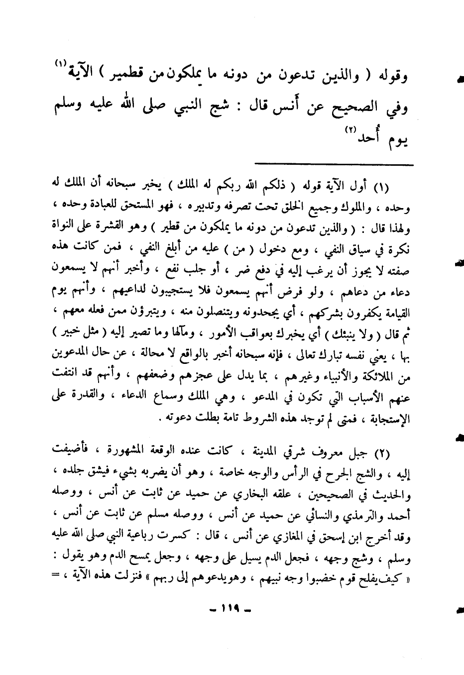 (2) جبل معروف شرقي المدينة، كانت عنده الوقعة المشهورة، فأضيفت إليه، والشج الجرح في الرأس والوجه خاصة، وهو أن يضربه بشيء فيشق جلده، والحديث في الصحيحين، علقه البخاري عن حميد عن ثابت عن أنس، ووصله أحمد والترمذي والنسائي عن حميد عن أنس، ووصله مسلم عن ثابت عن أنس، وقد أخرج ابن إسحق في المغازي عن أنس، قال: " كسرت رباعية النبي صلى الله عليه وسلم وشج وجهه، فجعل الدم يسيل على وجهه، وجعل يمسح الدم وهو يقول: "كيف يفلح قوم خضبوا وجه نبيهم، وهو يدعوهم إلى ربهم؟ فنزلت هذه الآية "4 =