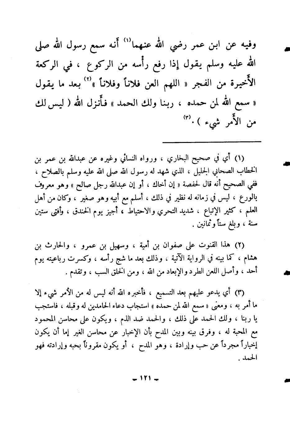 (3) أي يدعو عليهم بعد التسميع، فأخبره الله أنه ليس له من الأمر شيء إلا ما أمر به، ومعنى "سمع الله لمن حمده" استجاب دعاء الحامدين له وقبله، فاستجب يا ربنا، ولك الحمد على ذلك، والحمد ضد الذم، ويكون على محاسن المحمود مع المحبة له، وفرق بينه وبين المدح بأن الإخبار عن محاسن الغير إما أن يكون إخبارا مجردا عن حب وإرادة، وهو المدح، أو يكون مقرونا بحبه وإرادته فهو الحمد.