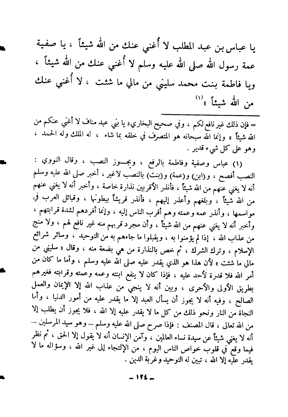 يا عباس بن عبد المطلب لا أغني عنك من الله شيئا، يا صفية عمة رسول الله صلى الله عليه وسلم لا أغني عنك من الله شيئا، ويا فاطمة بنت محمد سليني من مالي ما شئت، لا أغني عنك من الله شيئا " (1) .