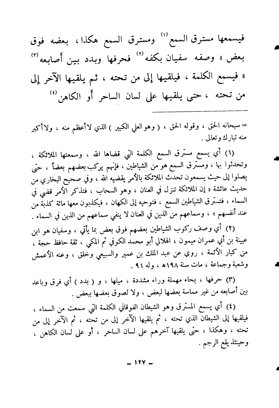 (4) أي يسمع المسترق وهو الشيطان الفوقاني الكلمة التي سمعت من السماء، فيلقيها إلى الشيطان الذي تحته، ثم يلقيها الآخر إلى من تحته، ثم الآخر إلى من تحته، وهكذا حتى يلقيها آخرهم على لسان الساحر، أو على لسان الكاهن، وحينئذ يقع الرجم.