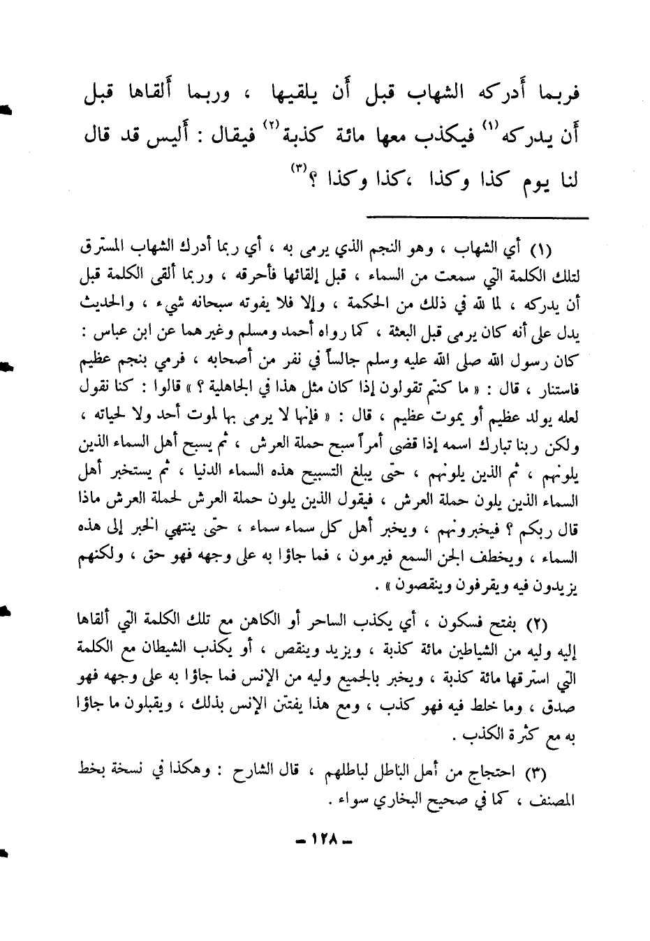 فربما أدركه الشهاب قبل أن يلقيها، وربما ألقاها قبل أن يدركه (1) ، فيكذب معها مائة كذبة (2) ، فيقال: أليس قد قال لنا يوم كذا وكذا، كذا وكذا؟ (3)