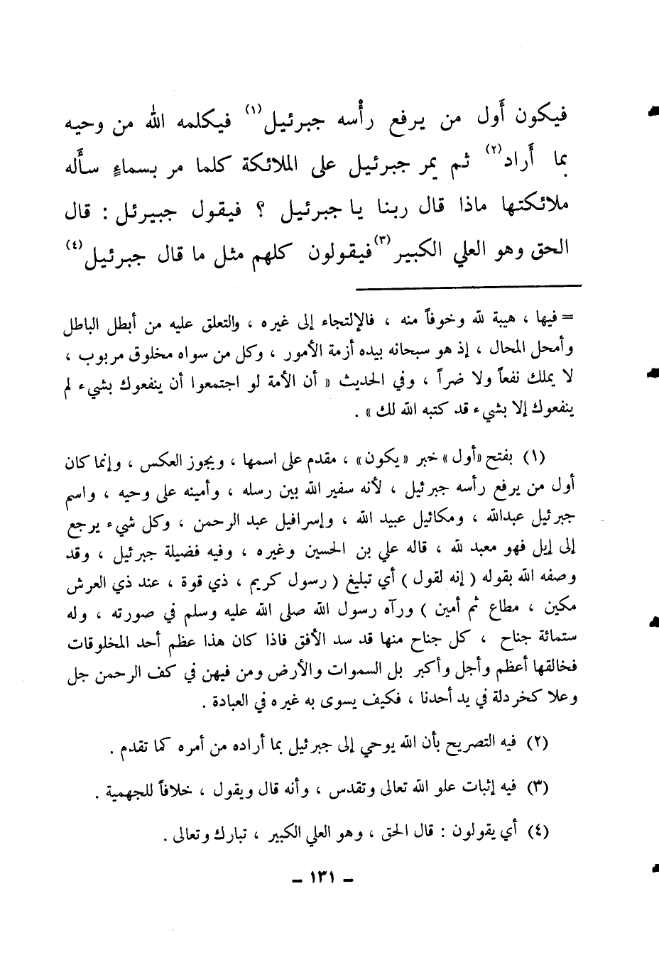 (1) بفتح "أول" خبر "يكون"، مقدم على اسمها، ويجوز العكس، وإنما كان أول من يرفع رأسه جبرائيل؛ لأنه سفير الله وبين رسله وأمينه على وحيه. واسم جبرائيل عبد الله، وميكائيل عبيد الله، وإسرافيل عبد الرحمن، وكل شيء يرجع إلى إيل فهو معبد لله، قاله علي بن الحسين وغيره. وفيه فضيلة جبرائيل، وقد وصفه الله بقوله: (إنه لقول) أي تبليغ: {رَسُولٍ كَرِيمٍ ذِي قُوَّةٍ عِنْدَ ذِي الْعَرْشِ مَكِينٍ مُطَاعٍ ثَمَّ أَمِينٍ} 2. ورآه رسول الله صلى الله عليه وسلم في صورته، وله ستمائة جناح، كل جناح منها قد سد الأفق، فإذا كان هذا عظم أحد المخلوقات فخالقها أعظم وأجل وأكبر، بل السماوات والأرض ومن فيهن في كف الرحمن جل وعلا كخردلة في يد أحدنا، فكيف يسوى به غيره في العبادة؟ .