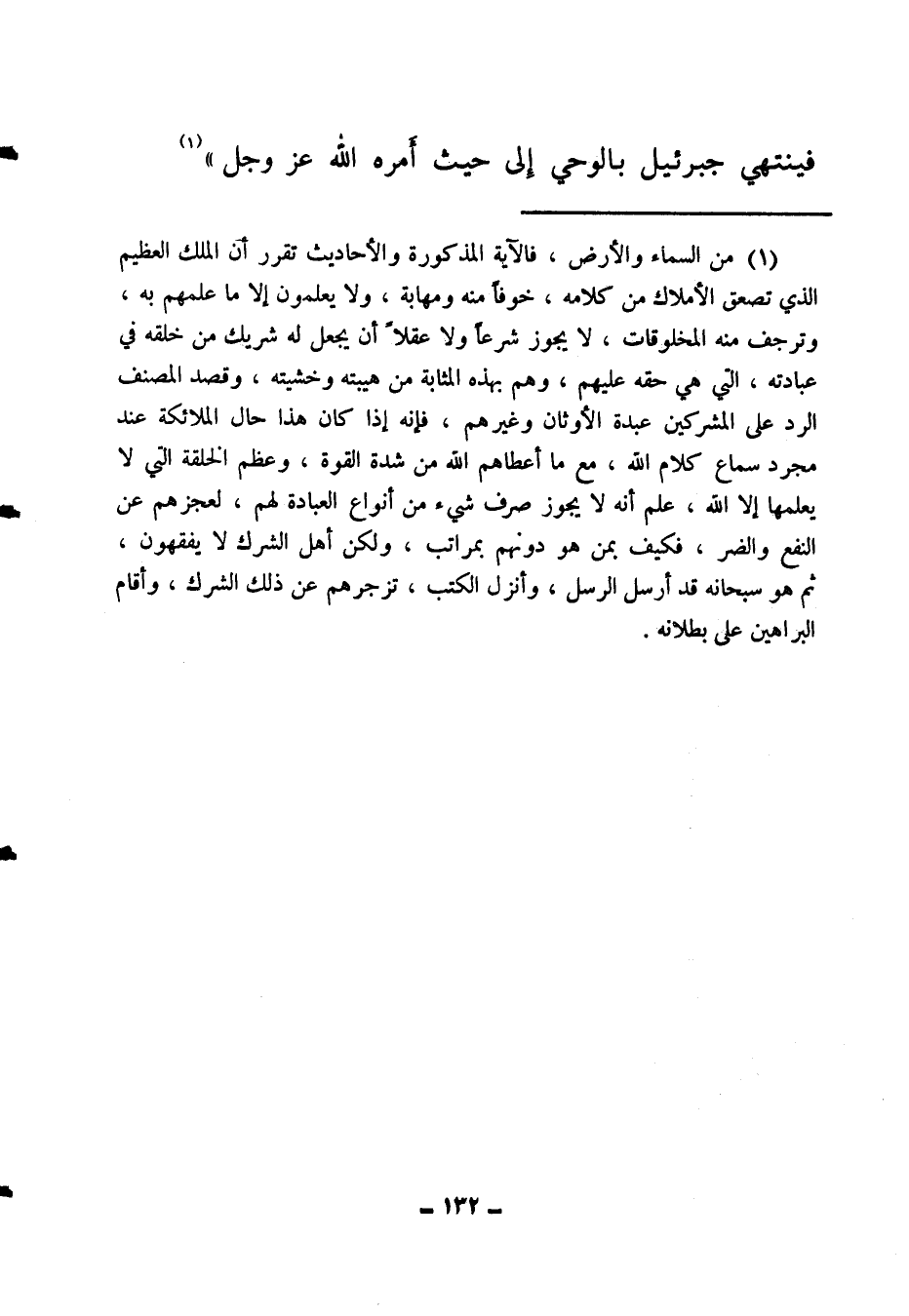 (1) من السماء والأرض، فالآية المذكورة والأحاديث تقرر أن الملك العظيم الذي تصعق الأملاك من كلامه، خوفا منه ومهابة، ولا يعلمون إلا ما علمهم به، وترجف منه المخلوقات، لا يجوز شرعا ولا عقلا أن يجعل له شريك من خلقه في عبادته التي هي حقه عليهم، وهم بهذه المثابة من هيبته وخشيته. وقصد المصنف الرد على المشركين عبدة الأوثان وغيرهم، فإنه إذا كان هذا حال الملائكة عند مجرد سماع كلام الله، مع ما أعطاهم الله من شدة القوة، وعظم الخلقة التي لا يعلمها إلا الله، علم أنه لا يجوز صرف شيء من أنواع العبادة لهم، لعجزهم عن النفع والضر، فكيف بمن هو دونهم بمراتب؟ ولكن أهل الشرك لا يفقهون، ثم هو سبحانه قد أرسل الرسل، وأنزل الكتب، تزجرهم عن ذلك الشرك، وأقام البراهين على بطلانه.