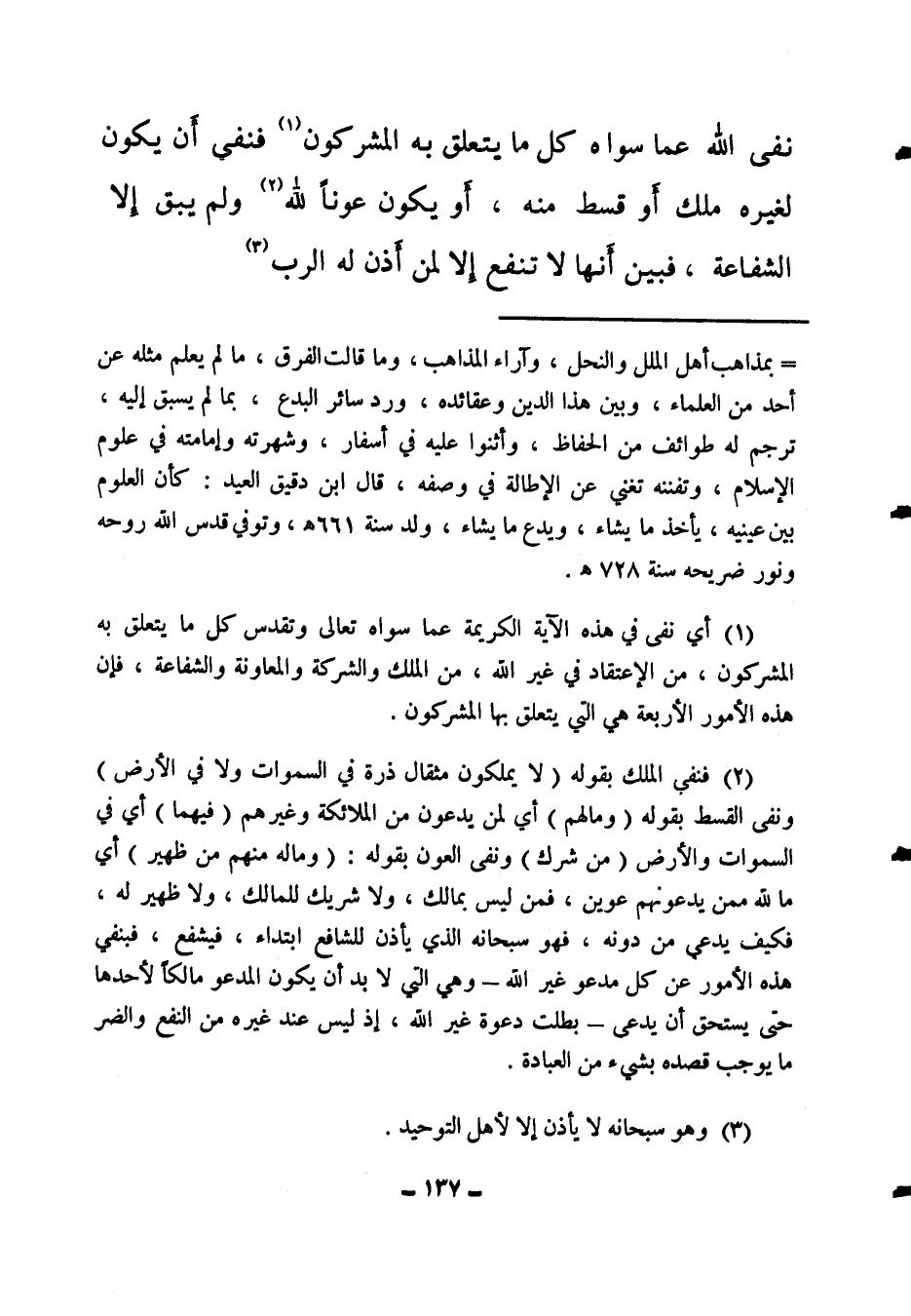 (1) أي نفى في هذه الآية الكريمة عما سواه -تعالى وتقدس- كل ما يتعلق به المشركون من الاعتقاد في غير الله، من الملك والشركة والمعاونة والشفاعة، فإن هذه الأمور الأربعة هي التي يتعلق بها المشركون.