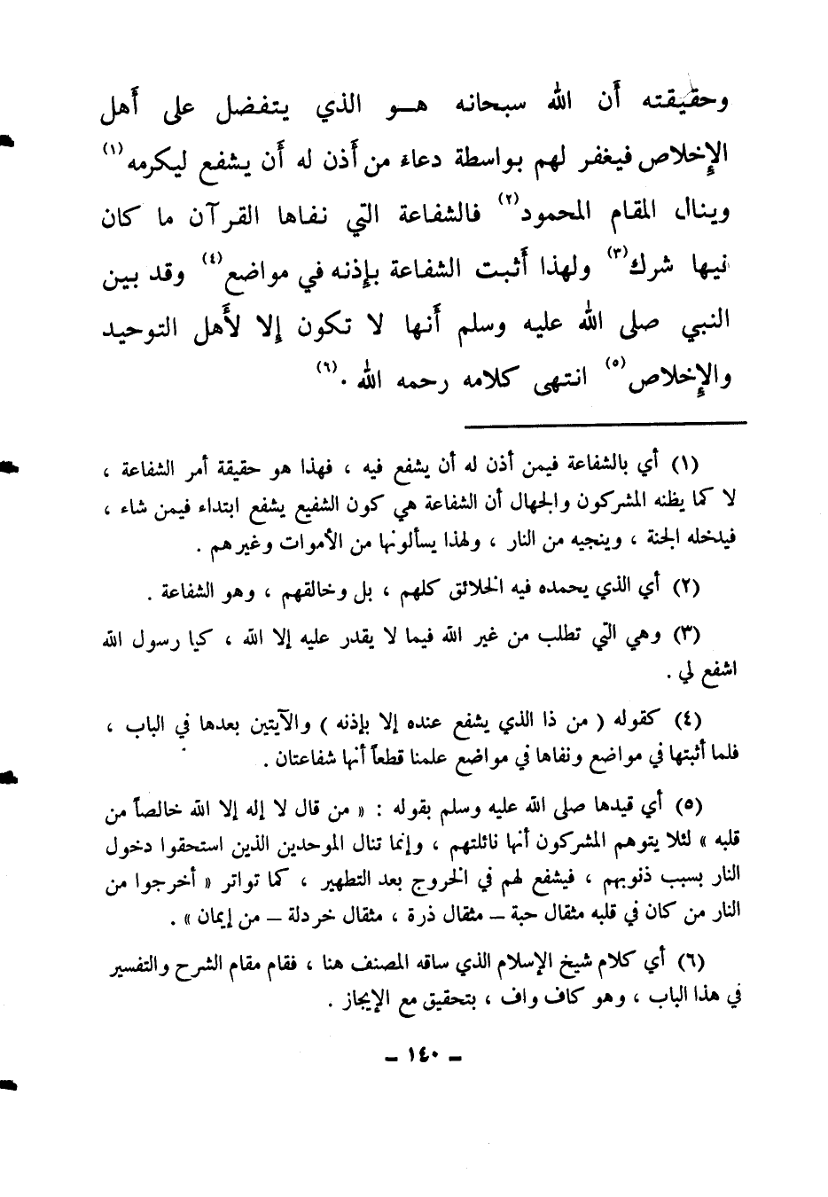 وحقيقته: أن الله سبحانه هو الذي يتفضل على أهل الإخلاص فيغفر لهم بواسطة دعاء من أذن له أن يشفع؛ ليكرمه (1) وينال المقام المحمود (2) ، فالشفاعة التي نفاها القرآن ما كان فيها شرك (3) ، ولهذا أثبت الشفاعة بإذنه في مواضع (4) ، وقد بين النبي صلى الله عليه وسلم أنها لا تكون إلا لأهل التوحيد والإخلاص (5) . انتهى كلامه رحمه الله (6) .