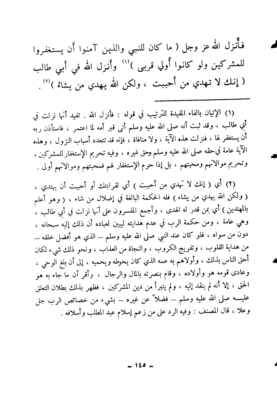 (2) أي: {إِنَّكَ لا تَهْدِي مَنْ أَحْبَبْتَ} 1 أي لقرابتك أو أحببت أن يهتدي،: {وَلَكِنَّ اللَّهَ يَهْدِي مَنْ يَشَاءُ} 2 فله الحكمة البالغة في إضلال من شاء،: {وَهُوَ أَعْلَمُ بِالْمُهْتَدِينَ} 3 أي بمن قدر له الهدى. وأجمع المفسرون على أنها نزلت في أبي طالب، وهي عامة، ومن حكمة الرب في عدم هدايته ليبين لعباده أن ذلك إليه سبحانه دون من سواه، فلو كان عند النبي صلى الله عليه وسلم - الذي هو أفضل خلقه- من هداية القلوب، وتفريج الكروب، والنجاة من العذاب، ونحو ذلك شيء لكان أحق الناس بذلك، وأولاهم به عمه الذي كان يحوطه ويحميه إلى أن بلّغ الوحي، وعادى قومه هو وأولاده، وقام بنصرته بالمال والرجال، وأقر أن ما جاء به هو الحق، إلا أنه لم ينقد إليه، ولم يتبرأ من دين المشركين، فظهر بذلك بطلان التعلق عليه صلى الله عليه وسلم - فضلا عن غيره- بشيء من خصائص الرب جل وعلا. قال المصنف: ((وفيه الرد على من زعم إسلام عبد المطلب وأسلافه)) .