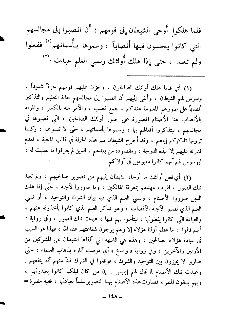 (2) أي فعل أولئك ما أوحاه الشيطان إليهم من تصوير صالحيهم، ولم تعبد تلك الصور، لقرب عهدهم بمعرفة الهالكين وما صوروا لأجله، حتى إذا هلك الذين صوروا الأصنام، ونسي العلم الذي فيه بيان الشرك والتوحيد، أو نسي العلم الذي نصبوا لأجله الأنصاب، وهو تذكر العلم الذي كانوا يأخذونه عنهم، والعبادة التي كانوا يفعلونها؛ ليتأسوا بهم فيها، عبدت تلك الصور، وفي رواية: أنهم قالوا: ما عظم أولنا هؤلاء إلا وهم يرجون شفاعتهم عند الله، فهذا هو السبب في عبادة هؤلاء الصالحين، وهذه هي الشبهة التي ألقاها الشيطان على المشركين من الأولين والآخرين. وفي رواية: "ونسخ" أي درست آثاره بذهاب العلماء، حتى صاروا لا يميزون بين التوحيد والشرك، فوقعوا في الشرك ظنا منهم أنه ينفعهم.