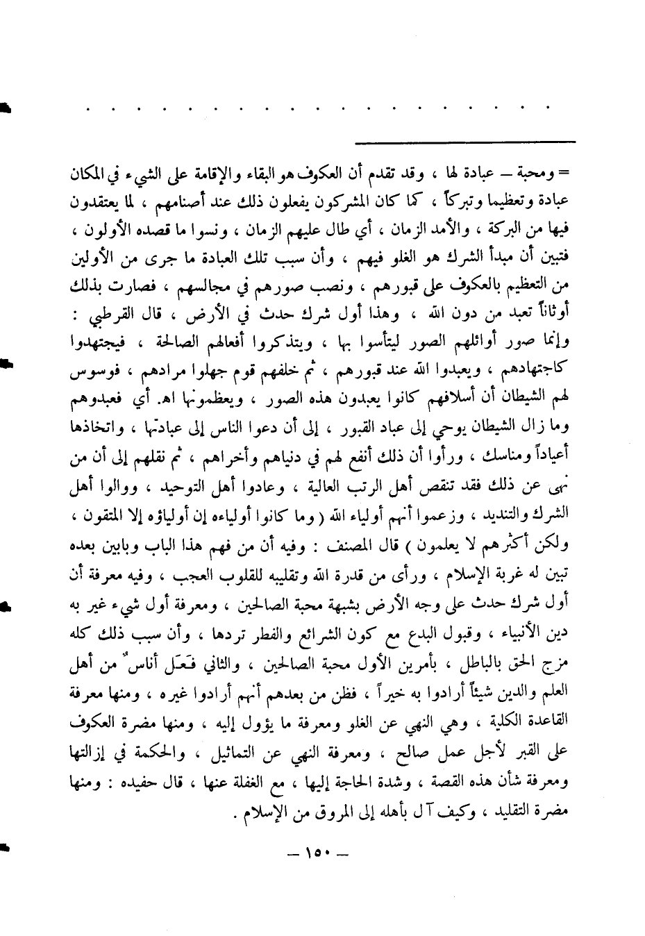 = ومحبة- عبادة لها، وقد تقدم أن العكوف هو البقاء والإقامة على الشيء في المكان عبادة وتعظيما وتبركا، كما كان المشركون يفعلون ذلك عند أصنامهم، لما يعتقدون فيها من البركة. والأمد: الزمان، أي طال عليهم الزمان، ونسوا ما قصده الأولون، فتبين أن مبدأ الشرك هو الغلو فيهم، وأن سبب تلك العبادة ما جرى من الأولين من التعظيم بالعكوف على قبورهم، ونصب صورهم في مجالسهم، فصارت بذلك أوثانا تعبد من دون الله، وهذا أول شرك حدث في الأرض.