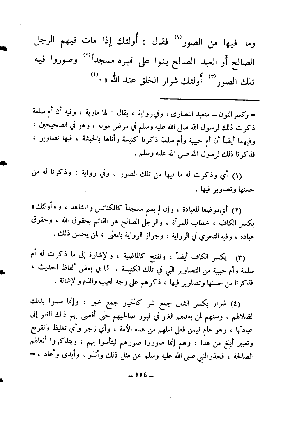 (4) شرار بكسر الشين جمع شر كالخيار جمع خير، وإنما سموا بذلك لضلالهم، وسنهم لمن بعدهم الغلو في قبور صالحيهم حتى أفضى بهم ذلك الغلو إلى عبادتها، وهو عام فيمن فعلهم من هذه الأمة، وأي زجر وأي تغليظ وتقريع وتعيير أبلغ من هذا؟ وهم إنما صوروا صورهم ليتأسوا بهم، ويتذكروا أفعالهم الصالحة، فحذر النبي صلى الله عليه وسلم عن مثل ذلك وأنذر، وأبدى وأعاد، =