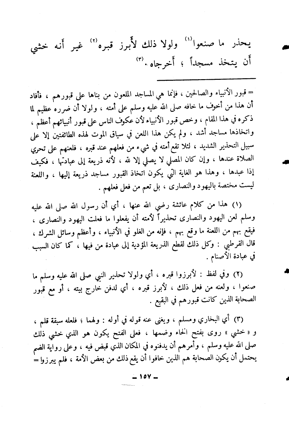 (2) وفي لفظ: لأبرزوا قبره، أي ولولا تحذير النبي صلى الله عليه وسلم ما صنعوا، ولعنه من فعل ذلك لأبرز قبره، أي لدفن خارج بيته، أو مع قبور الصحابة الذين كانت قبورهم في البقيع.