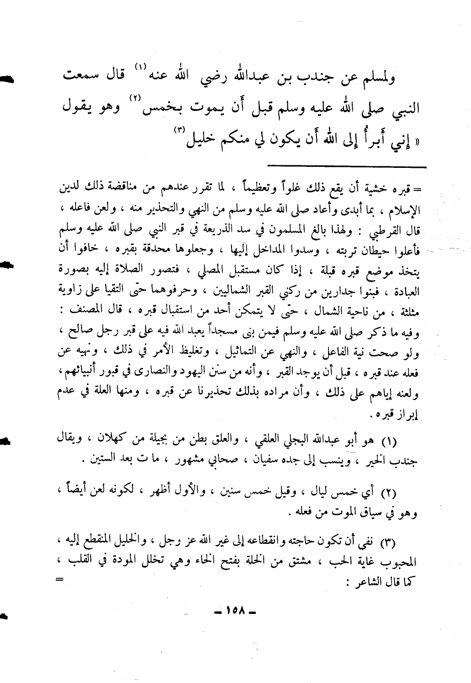 ولمسلم عن جندب بن عبد الله رضي الله عنه (1) قال: " سمعت النبي صلى الله عليه وسلم قبل أن يموت بخمس (2) وهو يقول: إني أبرأ إلى الله أن يكون لي منكم خليل (3) ؛