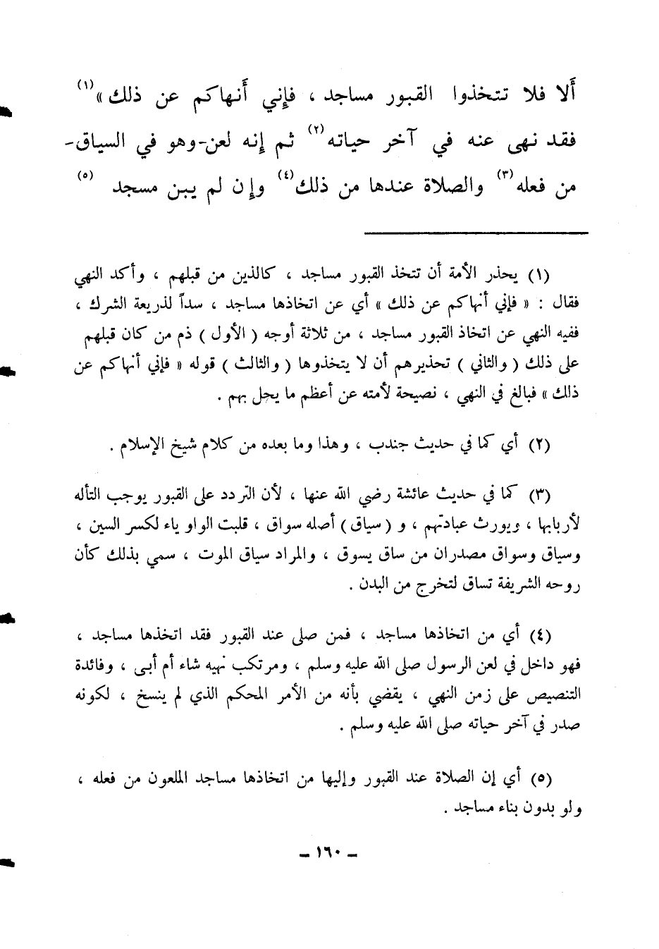 (5) أي إن الصلاة عند القبور وإليها من اتخاذها مساجد الملعون من فعله، ولو بدون بناء مساجد.
