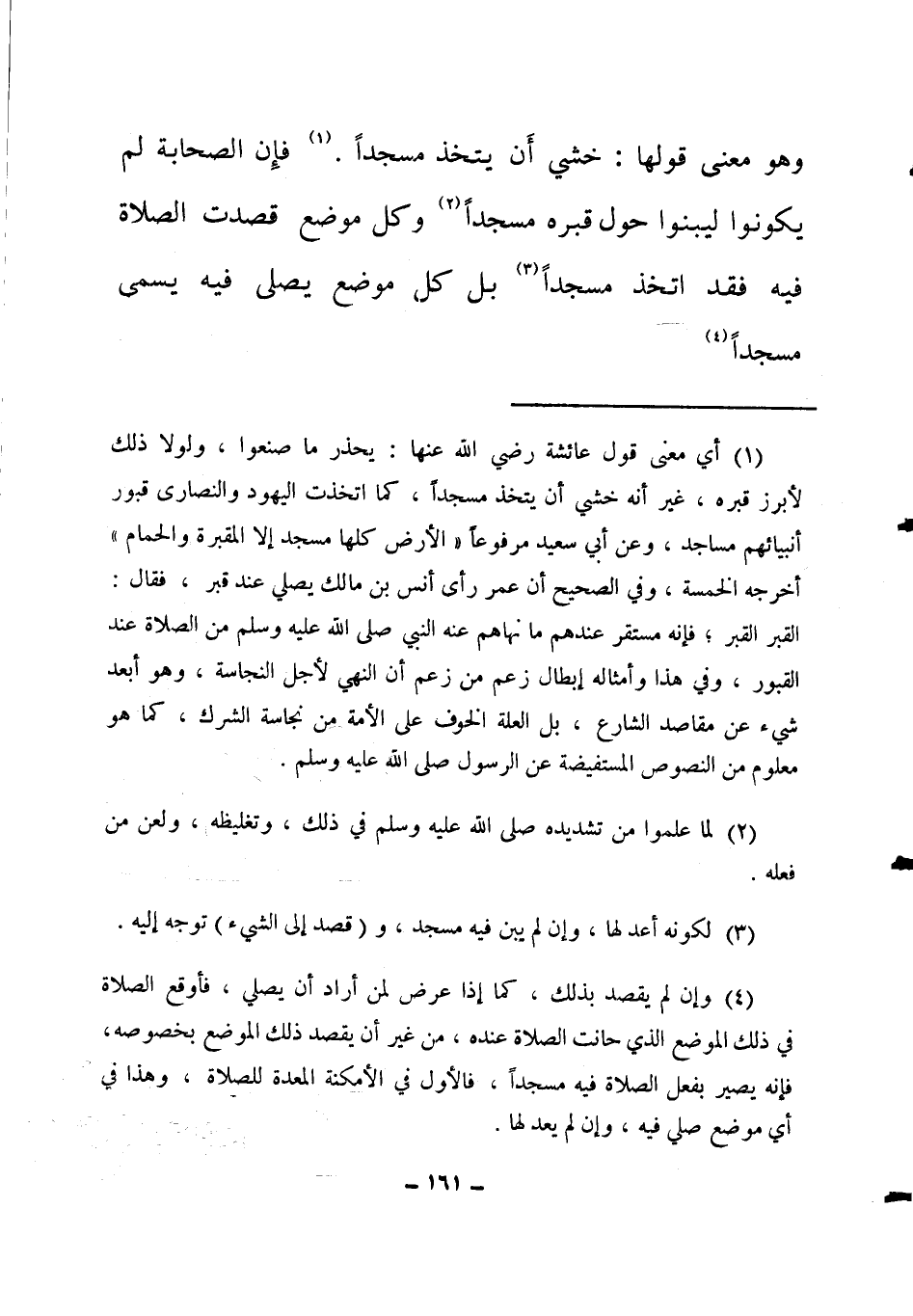 وهو معنى قولها: خشي أن يتخذ مسجدا (1) ؛ فإن الصحابة لم يكونوا ليبنوا حول قبره مسجدا (2) ، وكل موضع قصدت الصلاة فيه فقد اتخذ مسجدا (3) ، بل كل موضع يصلى فيه يسمى مسجدا (4) .