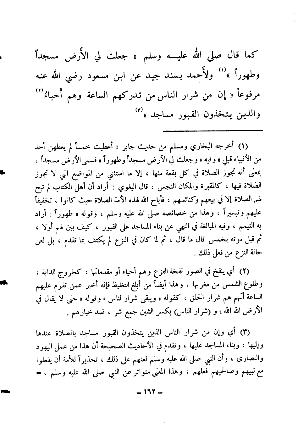 كما قال صلى الله عليه وسلم: " جعلت لي الأرض مسجدا وطهورا " 1 (1) . ولأحمد بسند جيد عن ابن مسعود رضي الله عنه مرفوعا: " إن من شرار الناس من تدركهم الساعة وهم أحياء (2) ، والذين يتخذون القبور مساجد (3) "2.