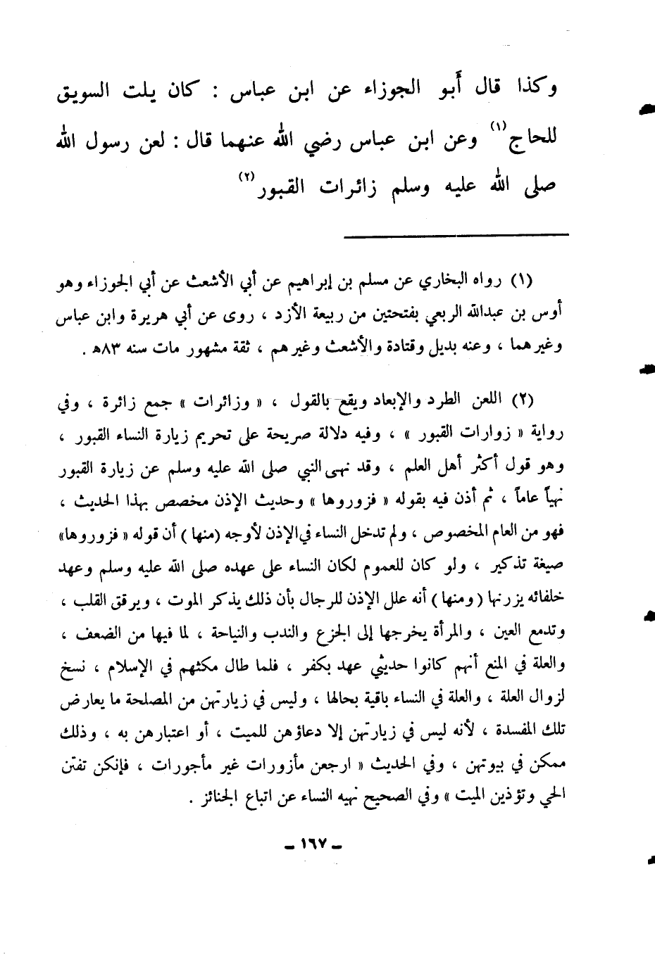 وكذا قال أبو الجوزاء عن ابن عباس: كان يلت السويق للحاج (1) . وعن ابن عباس -رضي الله عنهما- قال: " لعن رسول الله صلى الله عليه وسلم زائرات القبور (2) ،
