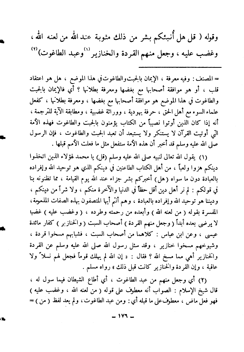 (2) أي وجعل منهم من عبد الطاغوت، أي أطاع الشيطان فيما سول له، قال شيخ الإسلام: الصواب أنه معطوف على قوله: (من لعنه الله وغضب عليه) فهو فعل ماض، معطوف على ما قبله أي: ومن عبد الطاغوت، ولم يعد لفظ (من) ؛ =